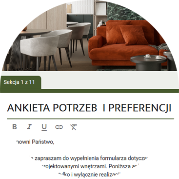 Ankieta potrzeb – czyli formularz Google, zawierający zarówno ogólne jak i szczegółowe pytania dotyczące oczekiwań, przyzwyczajeń oraz domowej organizacji. Pozwoli ona w prosty i obrazowy sposób przejść przez początkowy etap procesu.